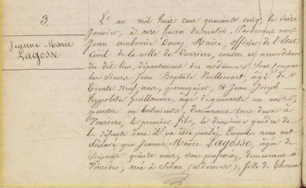 Elle est née vers 1779. Je n’ai pas trouvé son acte de naissance. Elle est restée célibataire. Elle est devenue repasseuse. Elle décède à Vouziers le 27 février 1861. Ses neveux qui font sa déclaration de décès n’ont pas d’informations pour préciser sa naissance.