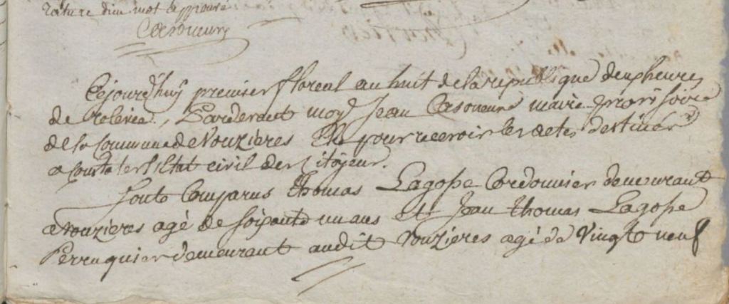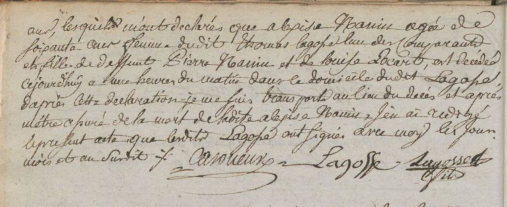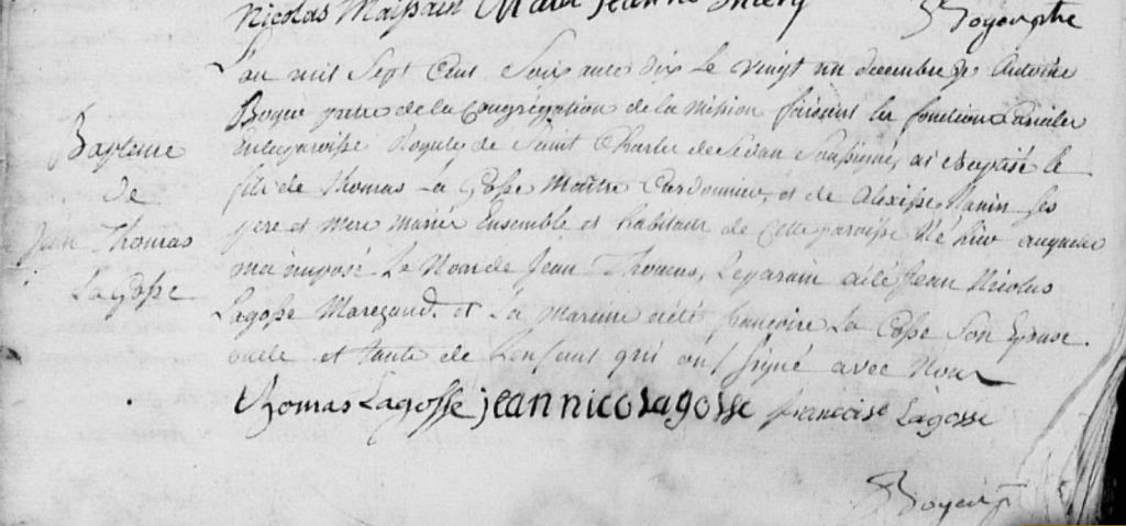 Le parrain de Thomas se nomme comme lui Thomas LAGOSSE. Sa Marraine se nomme Anne NANIN. Est-elle de la famille de la future femme de Thomas? Je peux le supposer mais vu les lacunes des archives cela va être compliqué à démontrer.