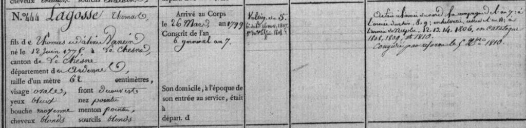 Il est né dans la commune du Chesne. Je n’ai pas d’acte de naissance les archives ayant été détruites. J’ai connaissance de son existence grâce à sa fiche militaire. Il est né le 12 juin 1775.