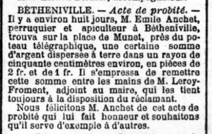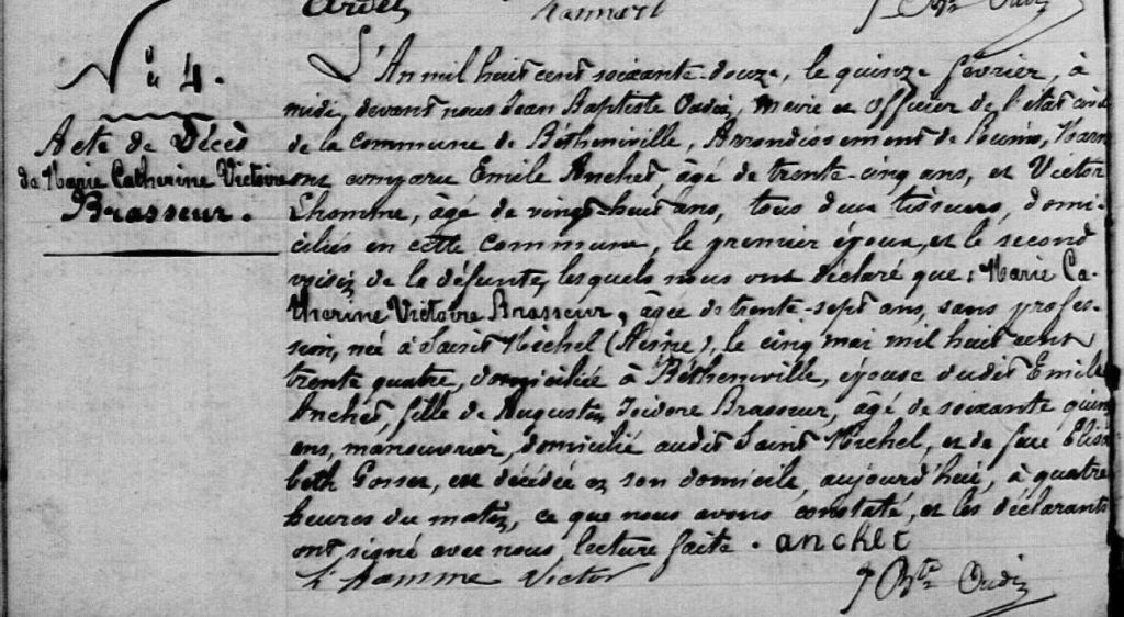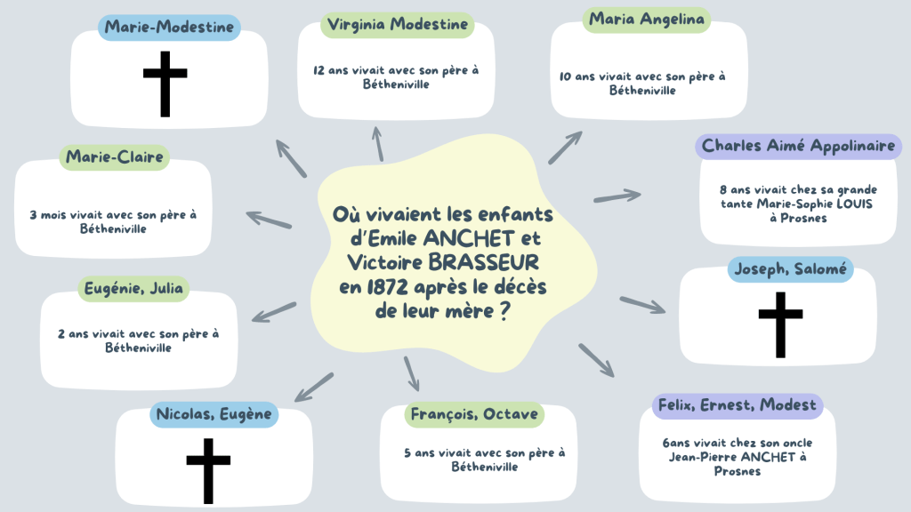 Cette année-là n’a pas dû être facile pour Emile qui se retrouve donc veuf avec sept enfants à charge. Ainsi lors du recensement de cette année-là, j’ai découvert que ses deux fils ainés vivaient dans la famille à Prosnes. Charles chez sa grande-tante Marie-Sophie LOUIS (indiquée comme sa grand-mère dans le recensement) et Felix, chez son oncle, le frère d’Emile, Jean-Pierre ANCHET.