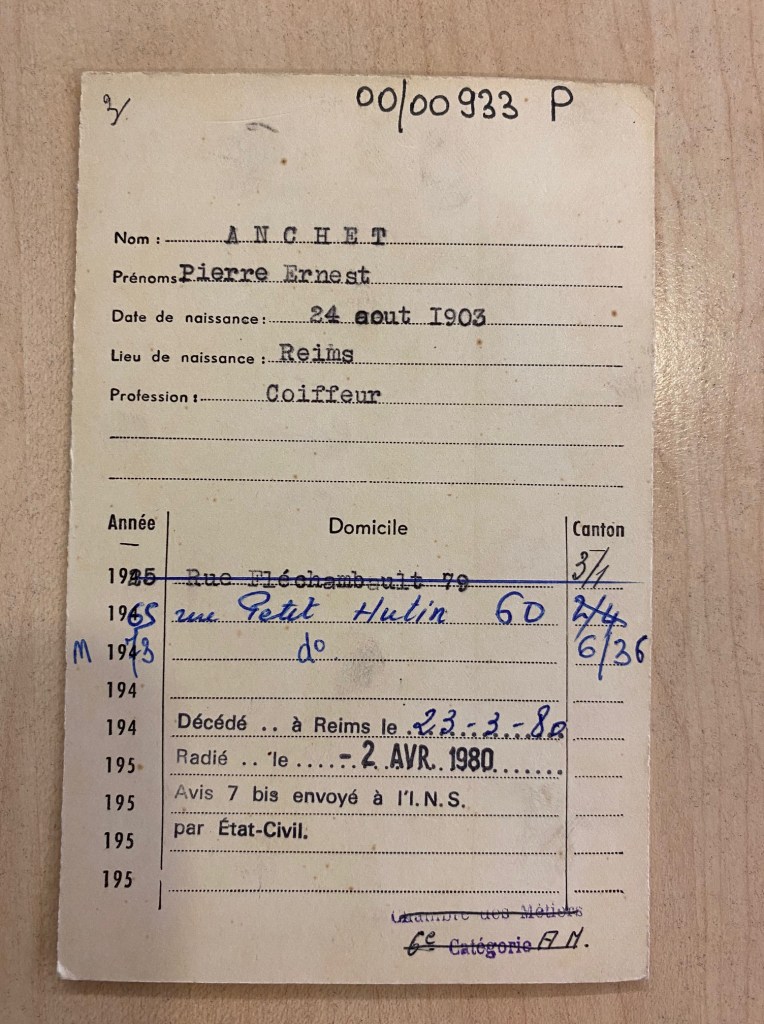 Ces fiches sont de vraies mines d’or. Elles permettent de voir les différents métiers effectués et de connaître les différentes adresses de la personne. J’ai pu retrouver le cousin de ma grand-mère ainsi que son fils. C’est sympa car ainsi on peut obtenir les adresse en l’absence de recensement consultable. Ainsi je peux tous les deux les rattacher à l’adresse « 79 rue fléchambaut » qui était le salon de coiffure de mon arrière-grand-père.