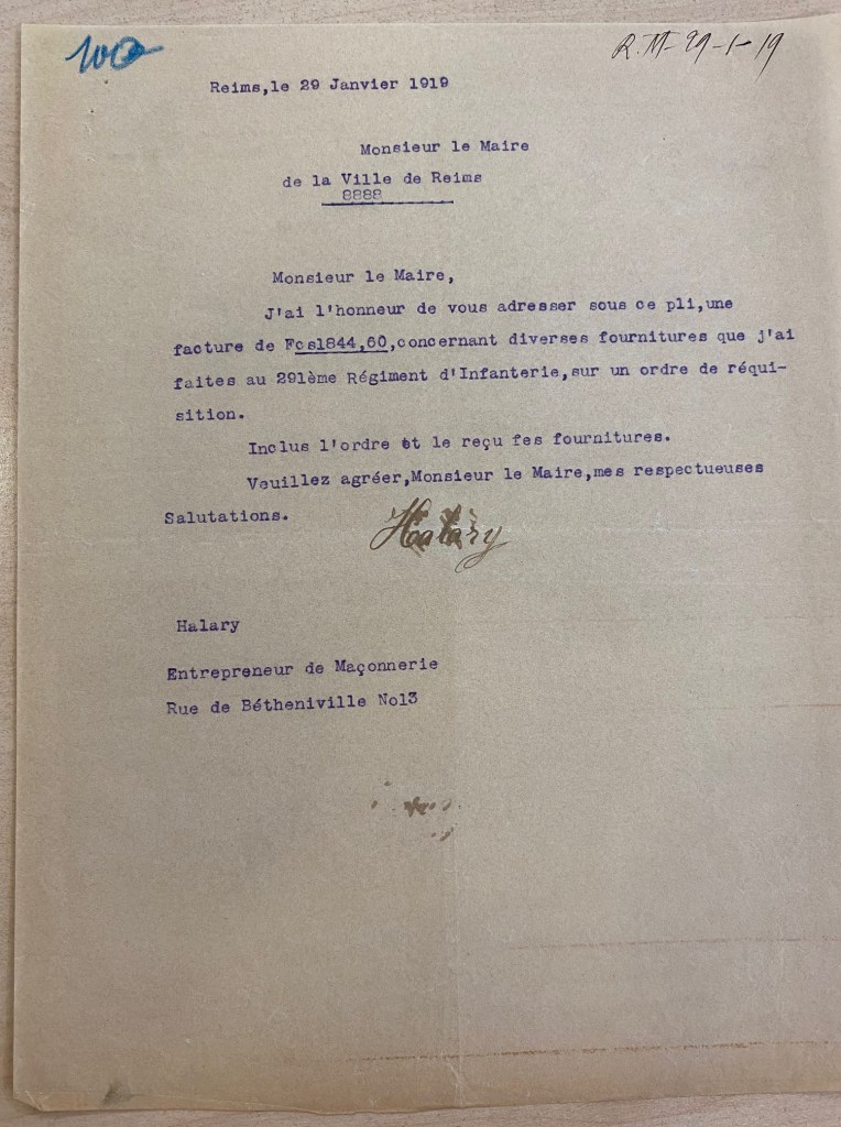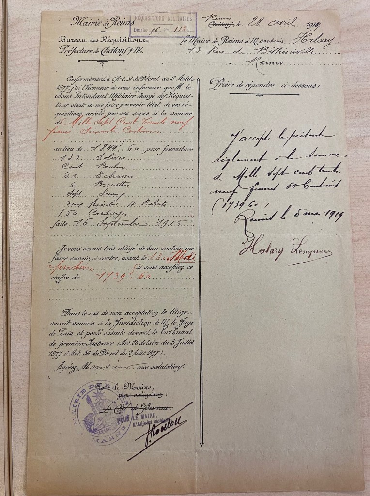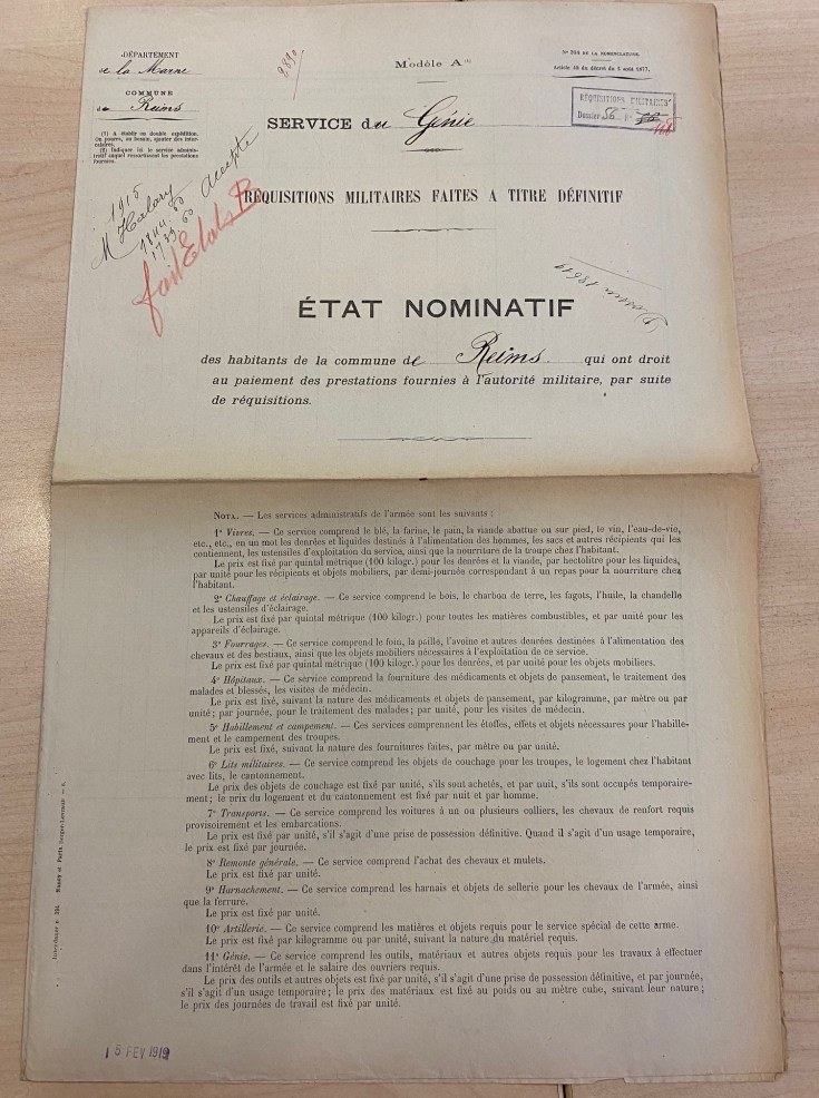 A Reims, ce sont des troupes françaises qui sont stationnées. L’armée ayant besoin de fournitures variées avait pris pour habitude de réquisitionner chez les rémois. Mais ces réquisitions n’étaient pas gratuites. A chaque réquisition des documents étaient rédigés pour que les personnes réquisitionnées puissent se faire indemniser.