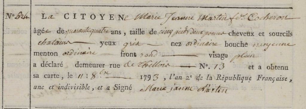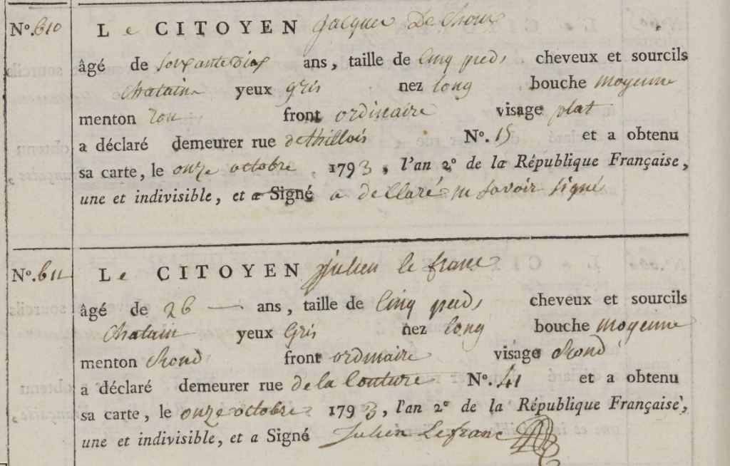 Ce registre est celui du « comité révolutionnaire de surveillance de la section Vesle devenue fraternité ». Celui-ci a été établie pour permettre d’établir une carte de citoyen. Vrai document d’identité il permet d’avoir, si on a la chance de l’y retrouver, le descriptif physique de son ancêtre, ainsi que l’adresse où il habitait à ce moment là. Petit exercice de mathématique car la taille est indiquée en pieds et pouces!