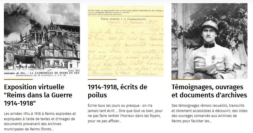 Vous pourrez y retrouver à la fois des témoignages de poilus à travers leurs écrits envoyés du front, mais aussi des témoignages de rémois qui ont vécu les bombardements et l’occupation allemande.