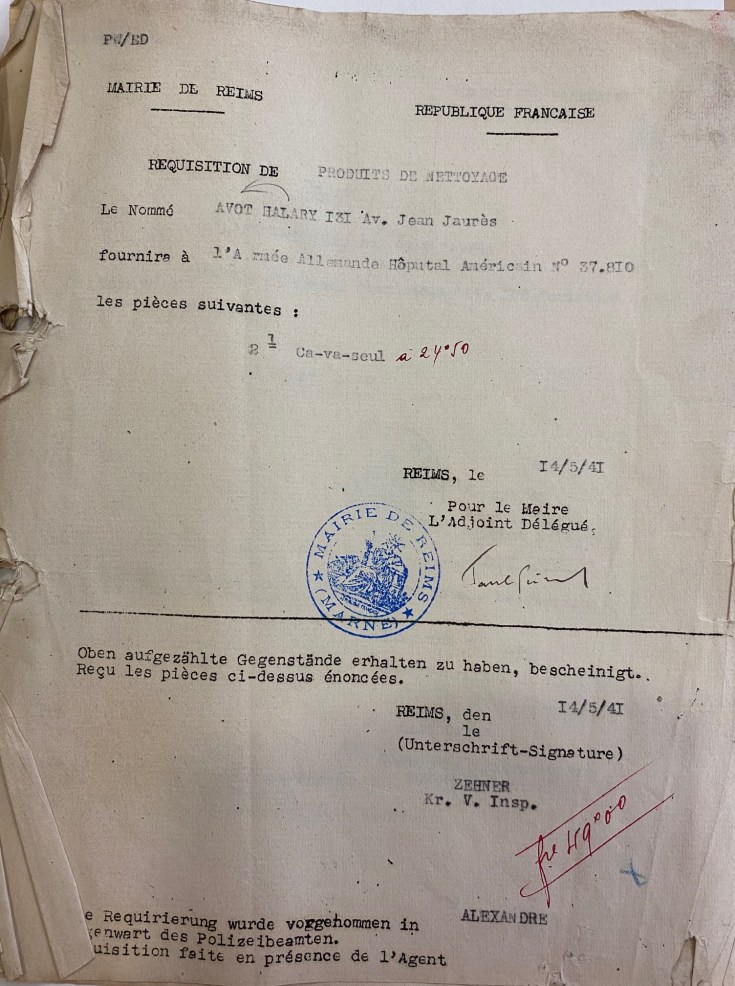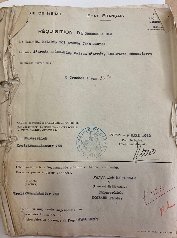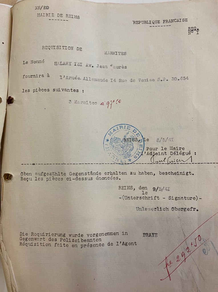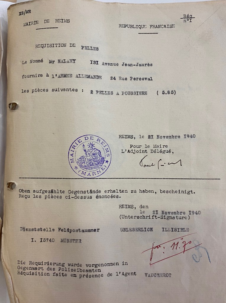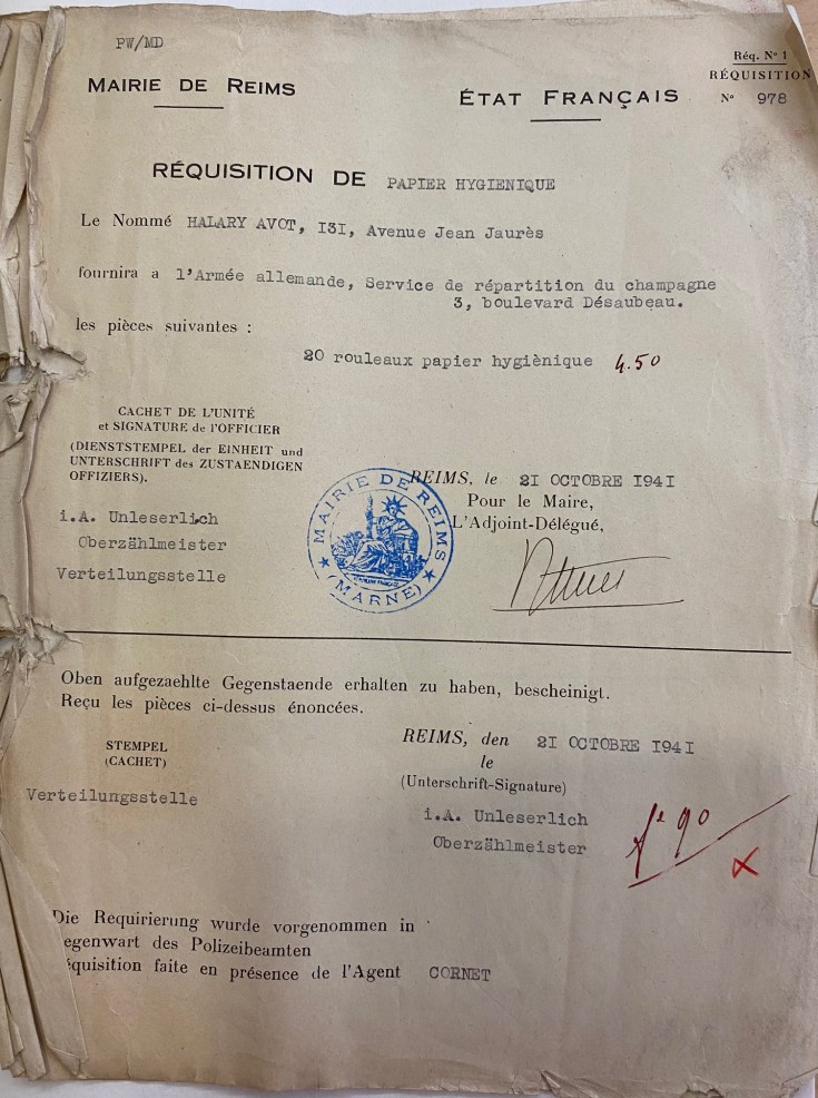 Un cousin de mon grand-père qui tenait une quincaillerie a reçu beaucoup de ces réquisitions, que ce soit des marmites, des cruches, du papier hygiénique.