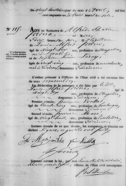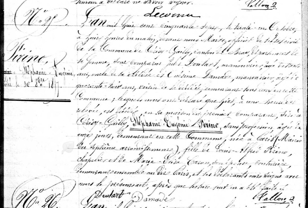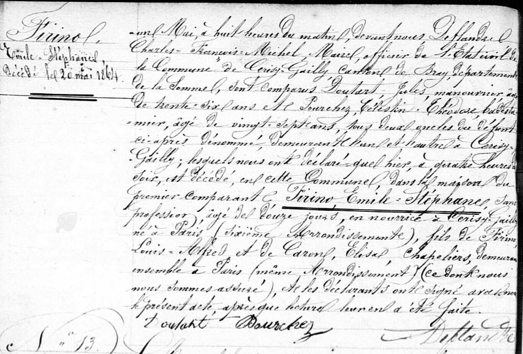 Louis Alfred Firino est né le 21 mai 1824 à Paris de Jean-Antoine Firino et Thérèse Menessier. Si je vous parle de lui c’est à cause de son destin particulier. Il est relié à ma généalogie par son mariage le 12 août 1850 avec Sophie Leroy la petite-fille de David Leroy et Julienne Cardin (mes chapeliers dont je vous ai parlé ici).