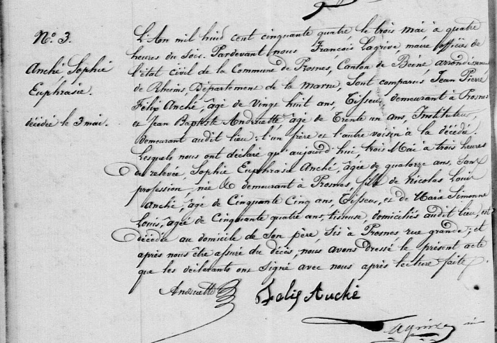 Elle décède sous le prénom de Sophie Euphrasie le 3 mai 1854.