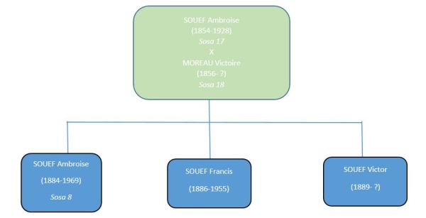 Victor est le dernier frère de mon arrière-grand-père Ambroise Souëf Comment cousinons-nous? Il est né le 19 octobre 1889 à Chateaugiron en Ille et Vilaine d'Ambroise et Victoire Moreau. Il est le quatrième de leurs cinq enfants et dernier fils. Il sera domestique. De la classe 1909, il est affecté au régiment d'infanterie de... Lire la Suite →