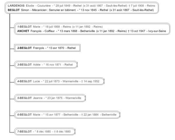 Elodie, fille de Jules Lardenois et Louise Lagosse épouse en 1867 Simon Béglot lui aussi natif de Rethel. Elodie alors mineure, elle a dix-huit ans, est accompagnée de sa grand-mère paternelle Marie-Elisabeth Verzeaux seule membre de sa famille encore vivant. Simon est serrurier et Elodie deviendra couturière. Ils auront six enfants : Marie-Elise, François, Adèle,... Lire la Suite →