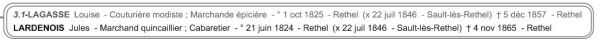 Jules Lardenois et Louise Lagasse sont cousins éloignés. En effet, la grand-mère de Jules est Marguerite Coutier et le grand-père de Louise est François le frère de Marguerite. Jules est garçon quincailler et Louise couturière modiste quand ils se marient en 1845. Ils auront deux enfants Jean-Baptiste qui ne vit que quelques jours en 1847,... Lire la Suite →