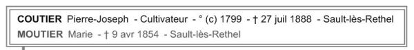 Voici le destin des enfants de Pierre-Joseph Coutier. Adelina épouse en 1861 Pierre Namur. Ils auront deux enfants une petite fille Marie Nicole en aout 1862 mais décédera en juin 1863 et un petit garçon Henri né en 1863. Adelina décède le 5 décembre 1863. Henri Pascal quant à lui deviendra cultivateur et épousera Marie-Mélezine... Lire la Suite →