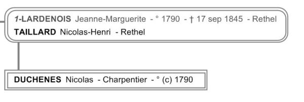Jeanne-Marie Lardenois est la fille d’Henri et Marguerite Coutier. Elle nait aux environs de 1790. Elle épouse en première noce Nicolas-Henri Taillard qui décèdera à Rethel. Elle épousera ensuite un charpentier Nicolas-Hubert Duchenes. Elle aura des enfants dont au moins une fille car son gendre est présent à la déclaration de son décès cependant je... Lire la Suite →