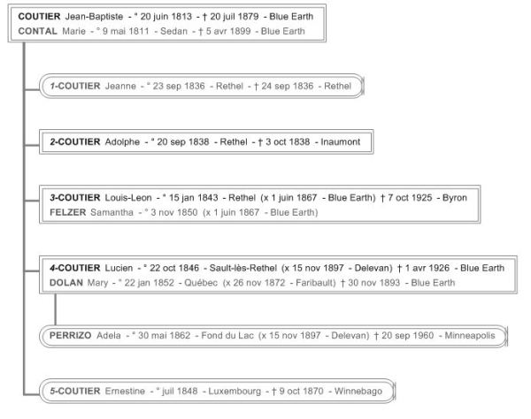 Jean-Baptiste est le seul fils de François Coutier et Antoinette Landragin. Il né a priori le 20 juin 1813 peut-être à Rethel. Il épouse en 1836 Marie, Agnès, Elisabeth, Contal fille d'un tailleur d'habits originaire de Meurthe-et-Moselle. Ils auront cinq enfants. Les quatre premiers naissent à Rethel : Jeanne (1836-1836), Adolphe (1838-1838), Léon en 1843... Lire la Suite →