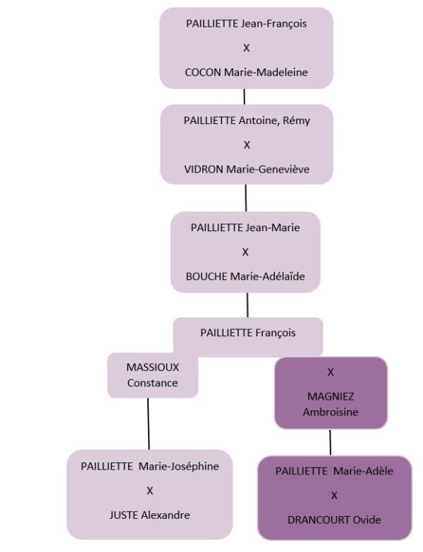 François Pailliette est né à Soissons en 1819 de Jean-Marie, cordonnier et de Marie-Adelaïde Bouché. Je ne lui connais ni frère ni sœur.Il sera peintre en décors. En 1841, vivant à Laon, il reconnaîtra le 16 février être le père de Marie-Joséphine Massioux née le 4 du même mois. Cependant il n'épousera jamais Constance, la... Lire la Suite →
